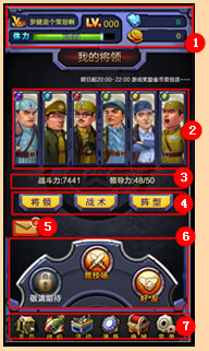 1.部队信息区:显示当前的部队等级,部队名称,部队体力以及部队当前的金币与充值币数额。